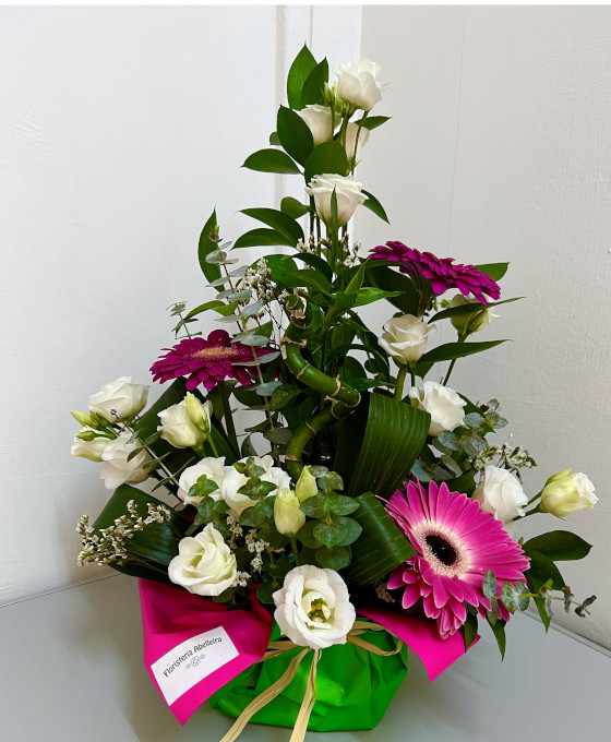 De diseño, aspecto primaveral y especialmente bonito es este Centro Bambú. Es un centro de flores de regalo compuesto por bonitas flores como las gerberas, los iris, los lisianthums, y con el especial toque del bambú, que le da un aspecto totalmente diferente y con un diseño especial, todo ello decorado también con bonitos verdes silvestres. En Floristería Abelleira de A Coruña, su floristería online, podemos ayudarle a hacer el regalo perfecto. Haremos llegar a su ser querido, todo el amor y alegría que quiere demostrar con los centros de flores de regalo a domicilio. Sin duda, lo que quiere es hacer el mejor regalo. Además, ofrecemos a nuestros clientes un servicio de envío de flores.