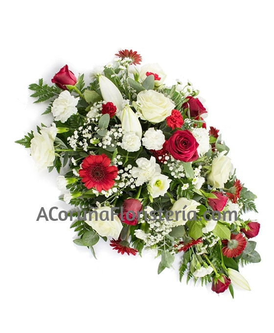 Bonito y fino este Centro Lágrima Blanco y Rojo para entregar en los Tanatorios de A Coruña. Es un centro para dar condolencias de flores para difuntos variadas, en tonos rosados, confeccionado con claveles, gerberas, paniculata y verdes variados que le dan al centro fúnebre un toque dulce y delicado. Nuestros centros de flores para tanatorio se envían a los Tanatorios como muestra de cariño, aprecio y acompañamiento para la familia de la persona fallecida.