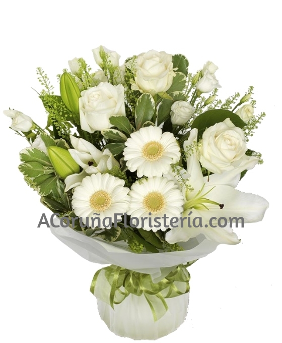 Precioso este Ramo Flores París, confeccionado con preciosas flores como son las rosas, el lilium, el lisianthum y las gerberas, en tonos blancos y decorado con elegantes verdes que realzan todavía más la belleza de las flores blancas. Sin duda, un ramo de flores blancas de regalo, especial para una ocasión especial, como puede ser dar la bienvenida a un bebé, regalar a una novia, o bien simplemente por el deleite de las flores blancas, muy apreciadas por la dulzura e inocencia que inspiran. Es el regalo perfecto, que sin duda podemos hacer si lo que queremos es alegrar un bonito día. Bonito ramo de flores blancas de regalo que presenta nuestra Floristería Online de Floristería Abelleira. En la floristería online de Floristería Abelleira ofrecemos un servicio de envío de flores a domicilio con la compra de cualquiera de nuestros arreglos florales. Algo idóneo para las flores blancas para regalar.