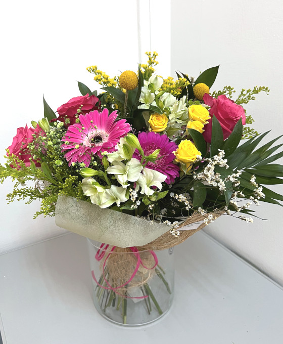 Precioso este Ramo Flores Primavera. Sin duda, un ramo de flores especial para una ocasión especial, como puede ser dar la bienvenida a un bebé, regalar a una novia, o bien simplemente por el deleite de las flores coloridas, muy apreciadas por la alegría y calidez que inspiran. Es el regalo perfecto, que sin duda podemos hacer si lo que queremos es alegrar un bonito día. Bonito ramo de flores de regalo que presenta nuestra Floristería Online de Floristería Abelleira. En la floristería online de Floristería Abelleira ofrecemos un servicio de envío de flores a domicilio con la compra de cualquiera de nuestros arreglos florales. Algo idóneo para las flores rosas para regalar.