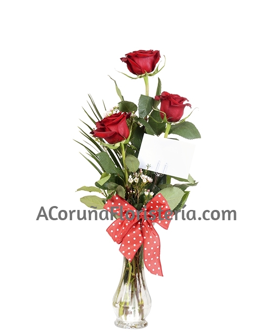 Siempre perfecto es este bonito Ramo de 3 Rosas de nuestra floristería de A Coruña. Regalar tres rosas es el detalle perfecto. Esta confeccionado con 3 rosas de tallo largo y decorado con paniculata, es el regalo perfecto para esa persona especial, e ideal para regalar en cualquier momento, si lo que queremos es enviar rosas rojas a domicilio. Si estás buscando rosas rojas para regalar, nuestros ramos de flores rojas son los ideales. Además, ofrecemos un servicio de envío de flores urgentes